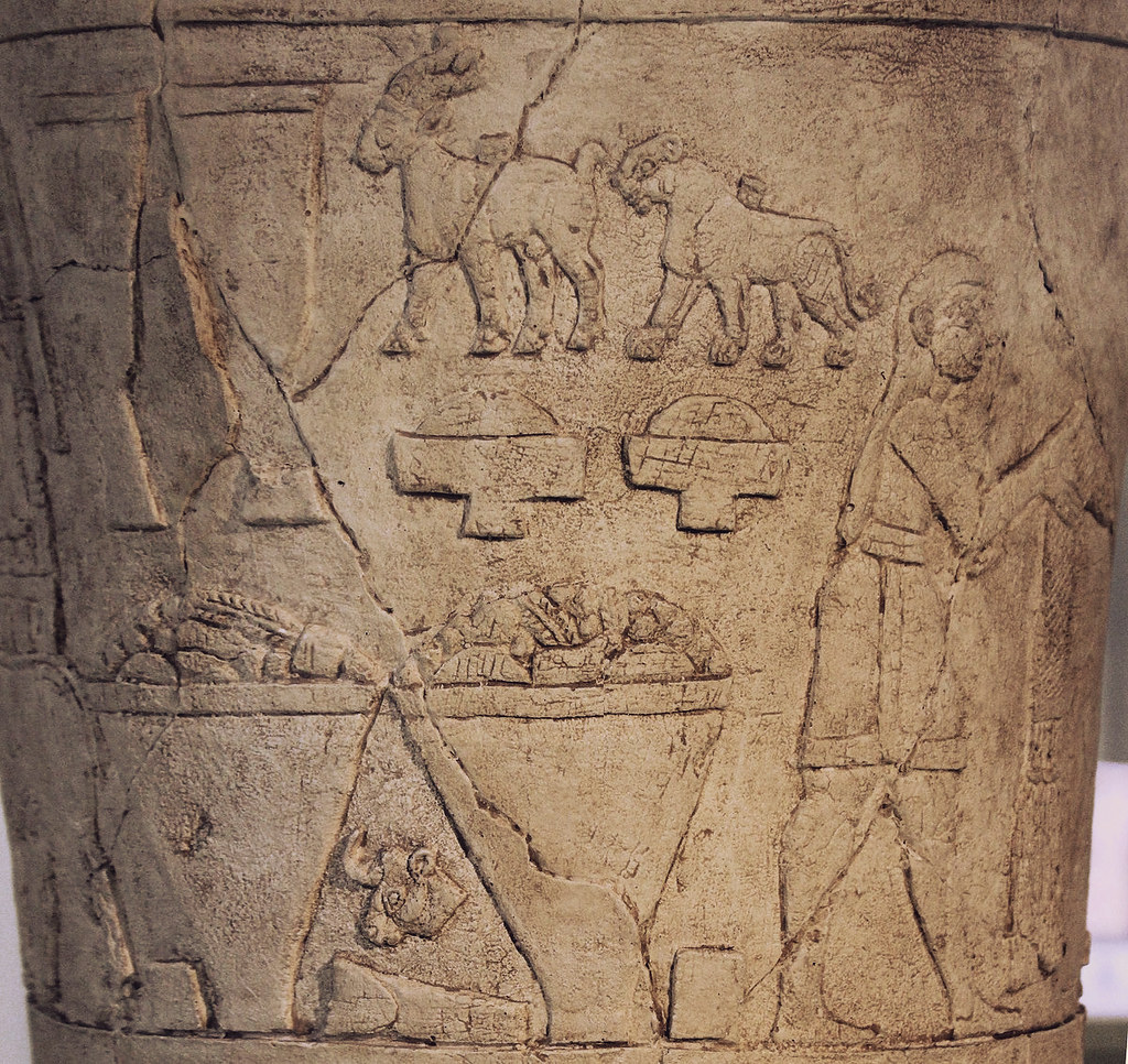 • The Morgan Library & Museum: [Plaster cast of the Uruk Vase | She Who Wrote: Enheduanna and Women of Mesopotamia, ca. 3400–2000 B.C. | The Morgan Library & Museum Online Exhibitions] offers details about the figures and a specific interpretation.
