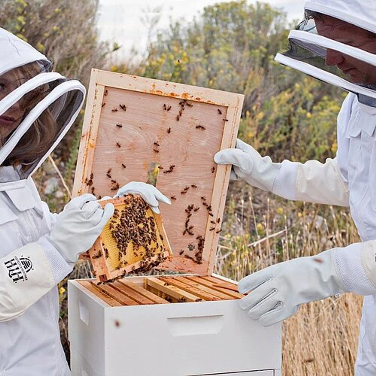(B) Beekeeping gloves are another crucial element. Opt for gloves made from a durable, sting-resistant material, with long cuffs that extend under the sleeves of your bee suit for added protection.