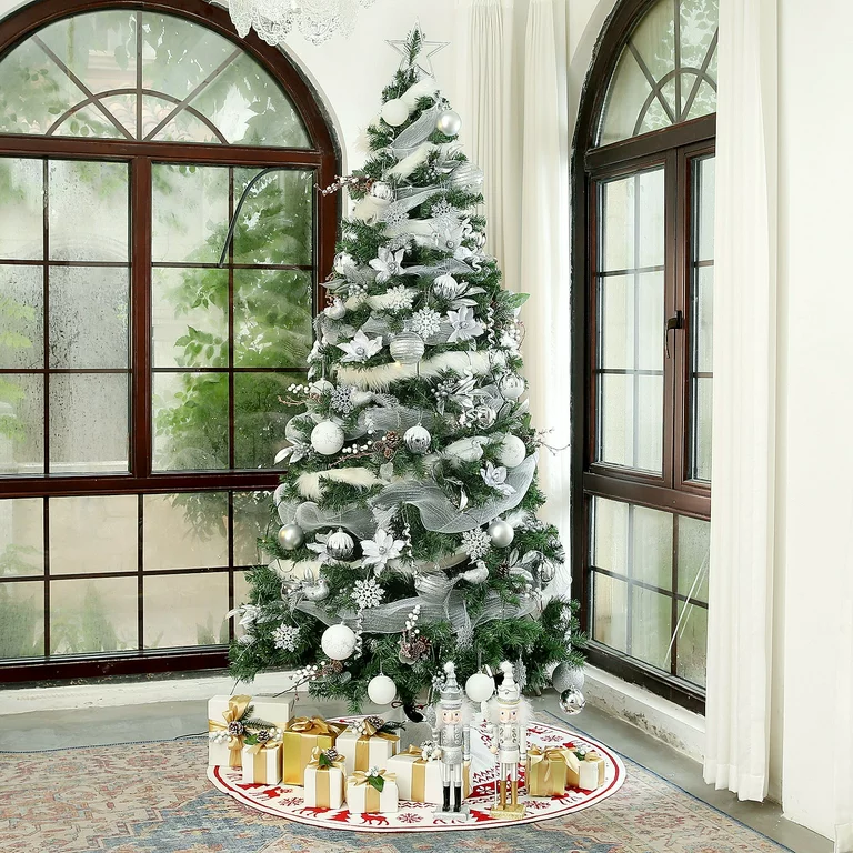 A green Christmas tree adorned with white ornaments is a picture of festive elegance. But the magic doesn’t have to stop there! By incorporating white-themed accents and seasonal touches throughout the surrounding area, you can create a truly cohesive and enchanting winter wonderland in your home.