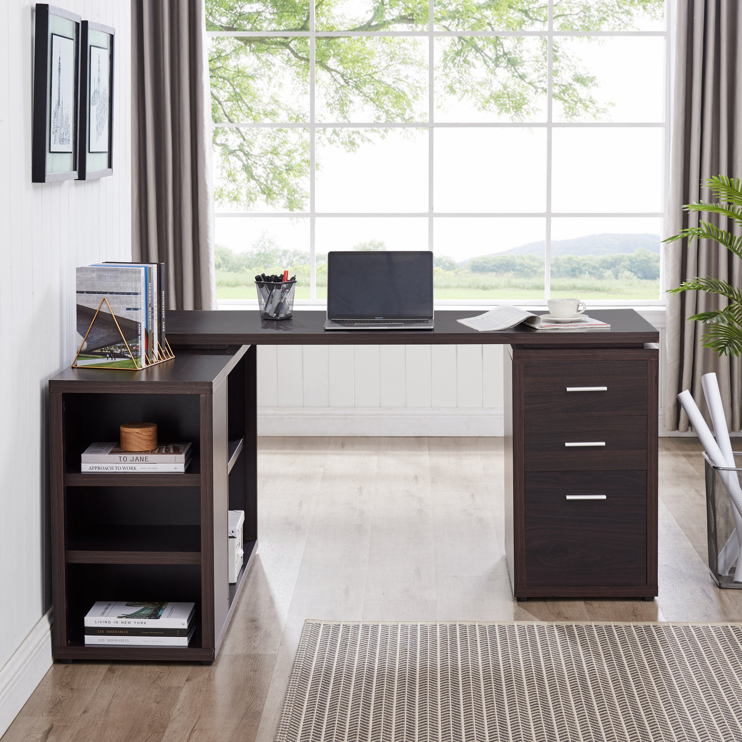A cluttered and disorganized workspace can negatively impact your productivity and mental well-being. With a corner desk equipped with filing cabinets, you can keep your office essentials neatly organized and easily accessible. Filing cabinets provide ample storage for important documents, files, and office supplies, helping you maintain a tidy and efficient workspace. By having a designated place for everything, you can quickly find what you need, eliminate distractions, and focus on the task at hand. An organized workspace also promotes a sense of calm and reduces stress, allowing you to work more efficiently and effectively.